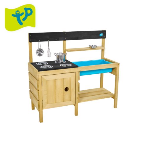 • Praktikus kialakítás: A tágas, élénkkék mosogató bőséges helyet biztosít a vízzel és sárral való kísérletezéshez, míg a tűzhely égőfejei és a praktikus alsó polc valódi konyhai hangulatot árasztanak.