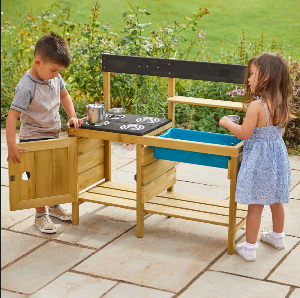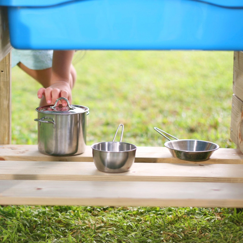 Induljon a kerti főzőcske a Junior fa sárkonyhával! Ez a kompakt, mégis sokoldalú kültéri játékkonyha mindennel fel van szerelve, amire egy kisgyereknek szüksége lehet: tágas kék mosogatótálcával és egy teljes rozsdamentes acél edénykészlettel érkezik. A fenntartható, FSC® minősítésű fából készült szerkezet már 3 éves kortól biztonságos és kreatív szórakozást nyújt a szabadban.